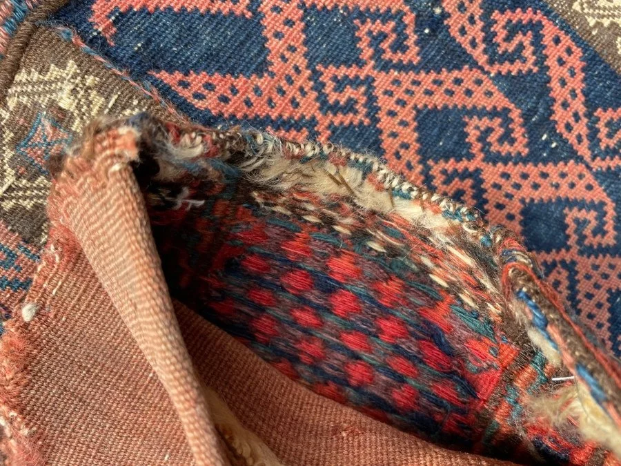 Nice example of a Khorasan flatwoven saltbag in good condition. Though the view inside the enck shows some fading due to sun exposure, the unfaded red look like it’s probably a natural dye.