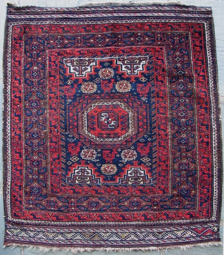 This very fine Salar Khani Baluch bagface displays various typical elements which, along with its fine weave, suggest attribution to the Salar Khani; these include the stepped half-elements at the top and bottom, the small rosettes with a good yellow, the central Turkmen design gul, and the use of metal thread in the end finish. Not typical of the group are the intense color, particularly the red, and the 6 crowned birds. Good wool, good condition.