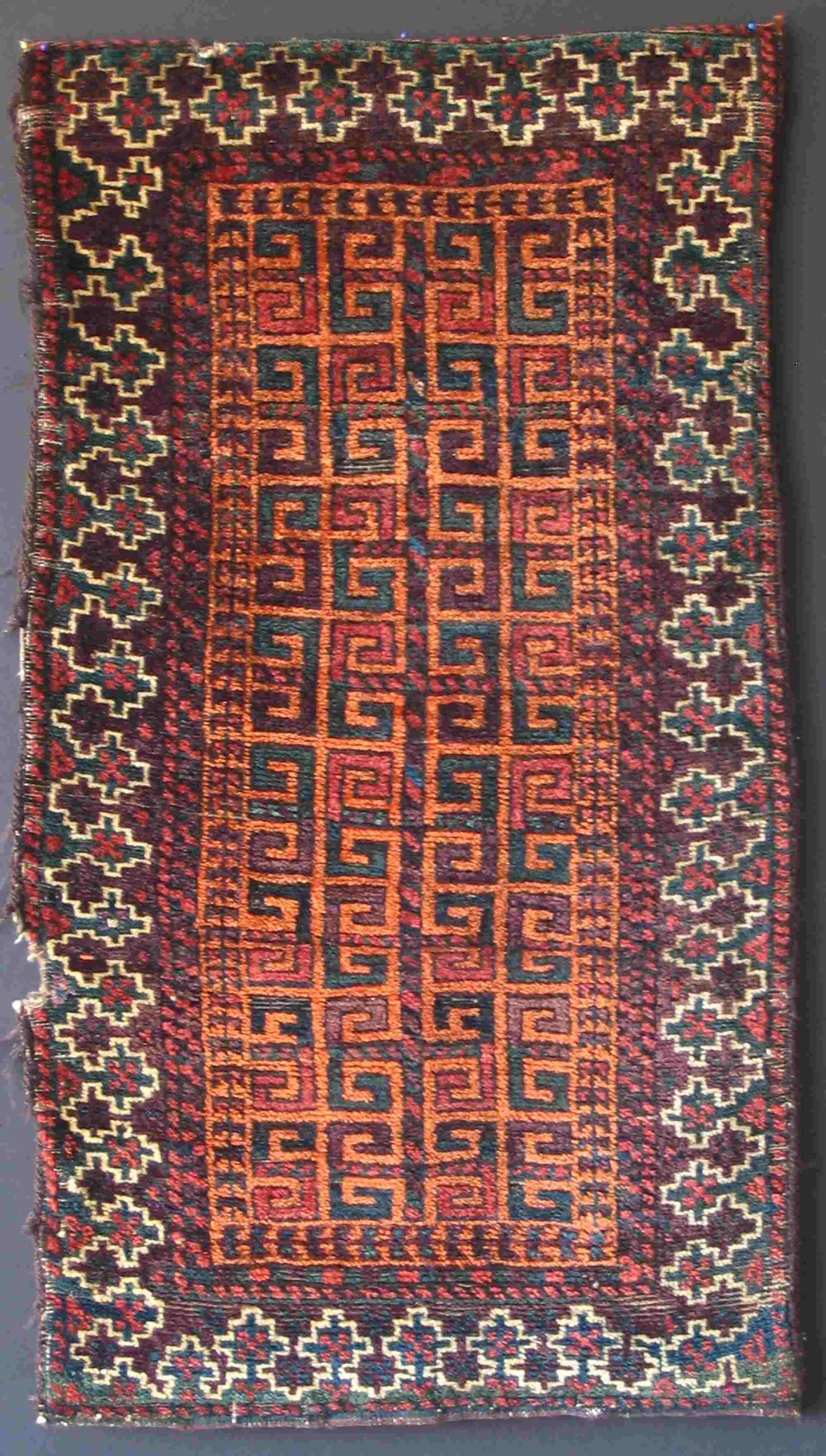 There is a great deal of variation in quality among this group of pillow faces from Seistan. This example, which has its plainweave camel colored back intact, has the soft wool that is one of the factors that separates the superior examples. It has an uncommon design, with enough playfulness and variation to give energy to the drawing. Its rich colors feature a lovely aubergine and a deep green (looks bluish in some of the pictures).